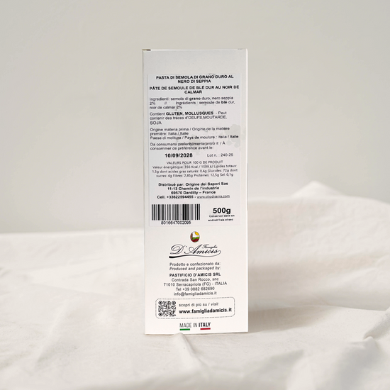 Semoule de blé dur des Pouilles et ENCRE DE SÈCHE, niente di più ! Pâtes typiques du Gargano, tréfilées au bronze et confectionnées à Serracapriola (Pouilles) par la famille d'Amicis. Artisanales, ces pâtes reflètent notre culture et notre façon de cuisiner. Des saveurs authentiques et un goût unique. Séchage lent à l'horizontale et à température ambiante.