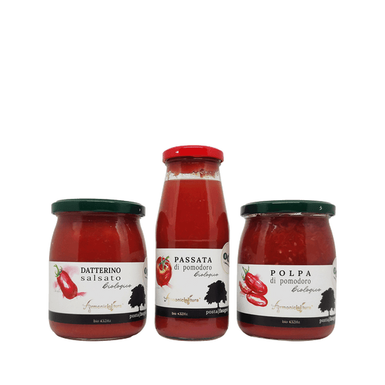 Les essayer, c'est les adopter ! Vous serez étonnés par le goût et la douceur de ces produits, obtenus grâce à la qualité des procédés de culture ARMONICOLTURA®. Les tomates sont récoltées à la main sur les sols de Posta Faugno, à San Paolo di Civitate dans le Gargano, pour ne sélectionner que les meilleures.