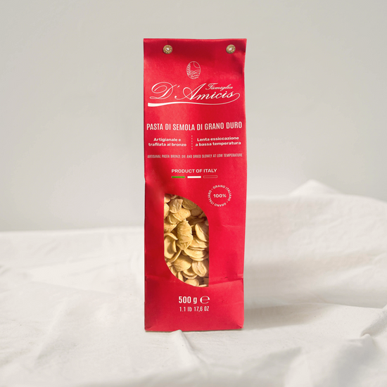 Depuis 1980, la famille d’Amicis confectionne à Serracapriola, dans le parc naturel du Gargano, des pâtes artisanales typiques des Pouilles. Élaborées à partir de blé dur, façonnées à la main et séchées lentement à l’horizontale et à basse température, elles conservent toute leur authenticité et leur goût unique. Véritable reflet de notre culture et de notre façon de cuisiner, ces pâtes offrent un plaisir italien à savourer !
