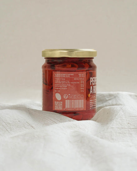 Ces petits légumes sont très populaires en Italie. Il existe en réalité plusieurs types de piments et tous ont en commun leur goût piquant qui est dû à leur molécule, la capsaïne. Mais ce goût piquant n’a pas la même intensité, le nôtre est d’intensité modérée à forte. Nos piments sont récoltés bien rouges, à maturité et sont ensuite coupés en rondelles puis trempés dans de l’huile d’olive vierge pour leur conservation.
