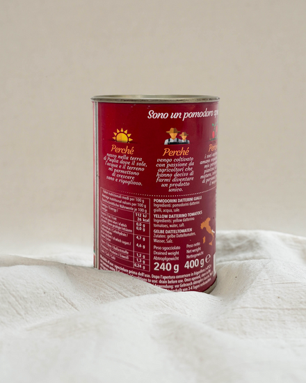 Les Datterini Gialli en conserve sont de délicieuses tomates italiennes. Conditionnées en conserve avec ouverture facile dans leur propre jus, sans additifs ni conservateurs. Cultivées par Rosso Gargano, une coopérative engagée dans la qualité et le respect du terroir. Leur chair sucrée et juteuse, leur peau fine et leur goût intense en font un ingrédient idéal pour sublimer vos sauces, pizzas et plats méditerranéens.